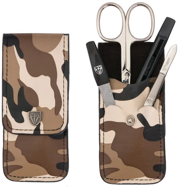 W skład zestawu wchodzą precyzyjne nożyczki do paznokci, pilnik szafirowy, skośna pęseta oraz dwustronne narzędzie do skórek i czyszczenia paznokci, co sprawia, że jest to kompleksowe rozwiązanie dla dbałości o wygląd dłoni. Całość zamknięta jest w eleganckim etui z ekoskóry w modnym wzorze kamuflażu, które jest odporne na uszkodzenia i atrakcyjne wizualnie. Wymiary etui : 11 x 5 cm.
